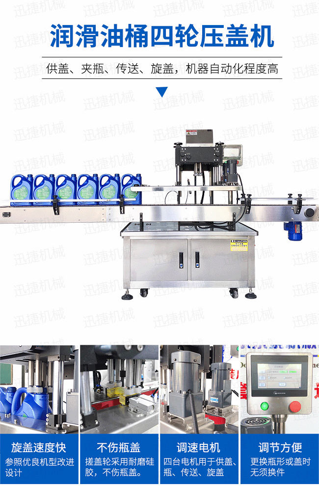 全自動旋蓋機是參照國機型改進設計、旋蓋速度快,合格率高、操作方便。可適用于食品、制藥、日化、農藥、化妝品等行業的不同瓶形的旋蓋。四臺調速電機分別用于供蓋、夾瓶、傳送、旋蓋,機器自動化程度高,穩定性好,調節方便,更換瓶形或蓋時無須備件,只需作調整即可完成(如配上蓋機,可進行自動上蓋)可以根據實際需要選配。