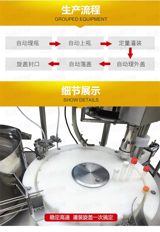 本機是在引進和吸收國外技術的基礎上,由我公司自主研發的一款IVD診斷試劑灌裝旋蓋一體機,能同時完成自動理瓶、自動上瓶、定量灌裝、自動理蓋、上蓋和旋蓋封口等動作。本機采用日本高精度封閉式凸輪分度工位器,精度高,運行可靠,使用壽命長。該分度器結構簡單,長期使用無需維修。該型號設備主要用于ⅣD體外診斷試劑制藥、生物制藥行業及科研領域裝。機器設計緊湊合理、外形簡潔美觀,灌裝量調節方便。