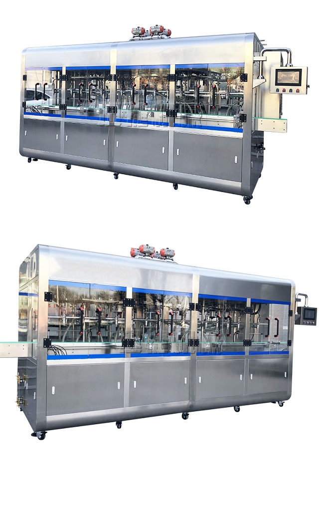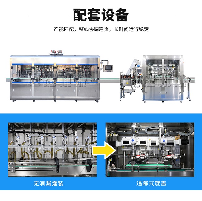 該灌裝機可以配置 高速旋蓋機 油桶貼標機 油瓶噴碼機 油壺自動自動裝箱碼垛機。組成油脂灌裝包裝流水線。高效、節能、自動化的設備。