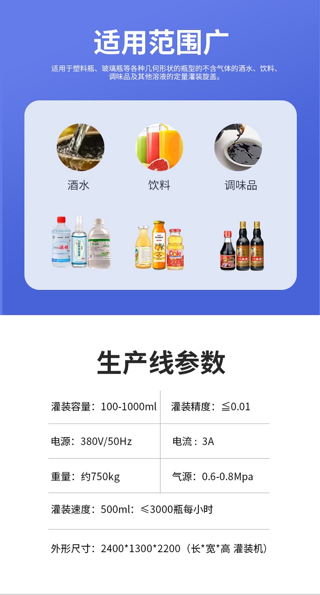 本機適用于多種材質,多種幾何形狀的容器,如塑料片、玻璃瓶、金屬瓶等;在需要更換瓶或蓋的時候,只要調整部分零件的位置即可,無需更換任何配件;在旋蓋過程中可以做到無瓶不下蓋。理蓋器、輸送機、旋蓋機、夾瓶皮帶速度可分別變頻調速,適應在規定范圍內的各類規格的旋蓋。(附:特殊規格定制即可)