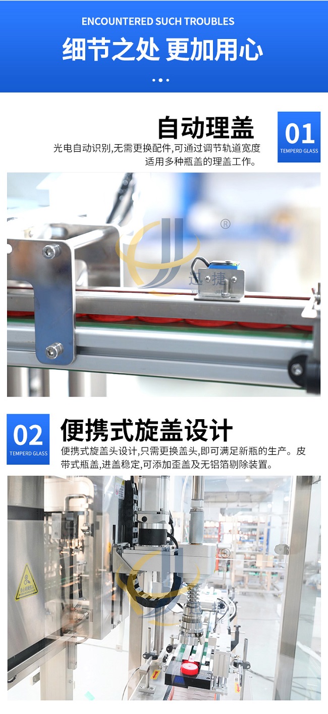 跟蹤式旋蓋機(jī)是在聯(lián)機(jī)取放旋蓋機(jī)的基礎(chǔ)上設(shè)計(jì)的,它解決了聯(lián)機(jī)拾放旋蓋機(jī)容量低的問(wèn)題,其運(yùn)動(dòng)由運(yùn)動(dòng)控制器控制,比PLC更、更準(zhǔn)確,封蓋時(shí),封蓋頭隨著瓶子的移動(dòng)而移動(dòng)。它可以配備一個(gè)或兩個(gè)封蓋頭,容量從 40B/M 到70B/M 無(wú)需考慮瓶子和蓋子的大小(基于 100ML到5000ML瓶子)。