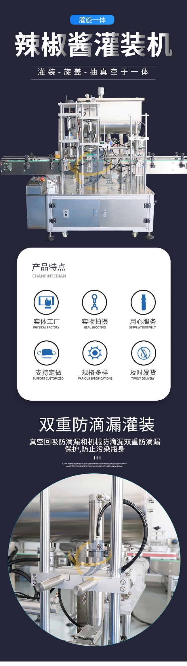 迅捷機械加工設備齊全,技術力量雄厚,選用德國PLC控制系統、臺灣AirTac的氣動組件和臺灣伺服的電控組件,從這幾個部件可以看的出來全自動牛肉醬灌裝機改善的不僅是質量,生產效率和產品的外觀包裝,還會不斷的引進國際上新的科學技術,全自動牛肉醬灌裝機用更好的質量滿足生活的需求。在自動化生產日漸普及的今天,全自動牛肉醬灌裝機讓企業的商品以更快的速度出現在市場中,畢竟一些繁雜的工作讓人工去完成的話不但麻煩,效率也不會很高,想要適應現代化的大規模批量生產,就需要全自動牛肉醬灌裝機的幫助來代替人工完成這些繁雜的工作。